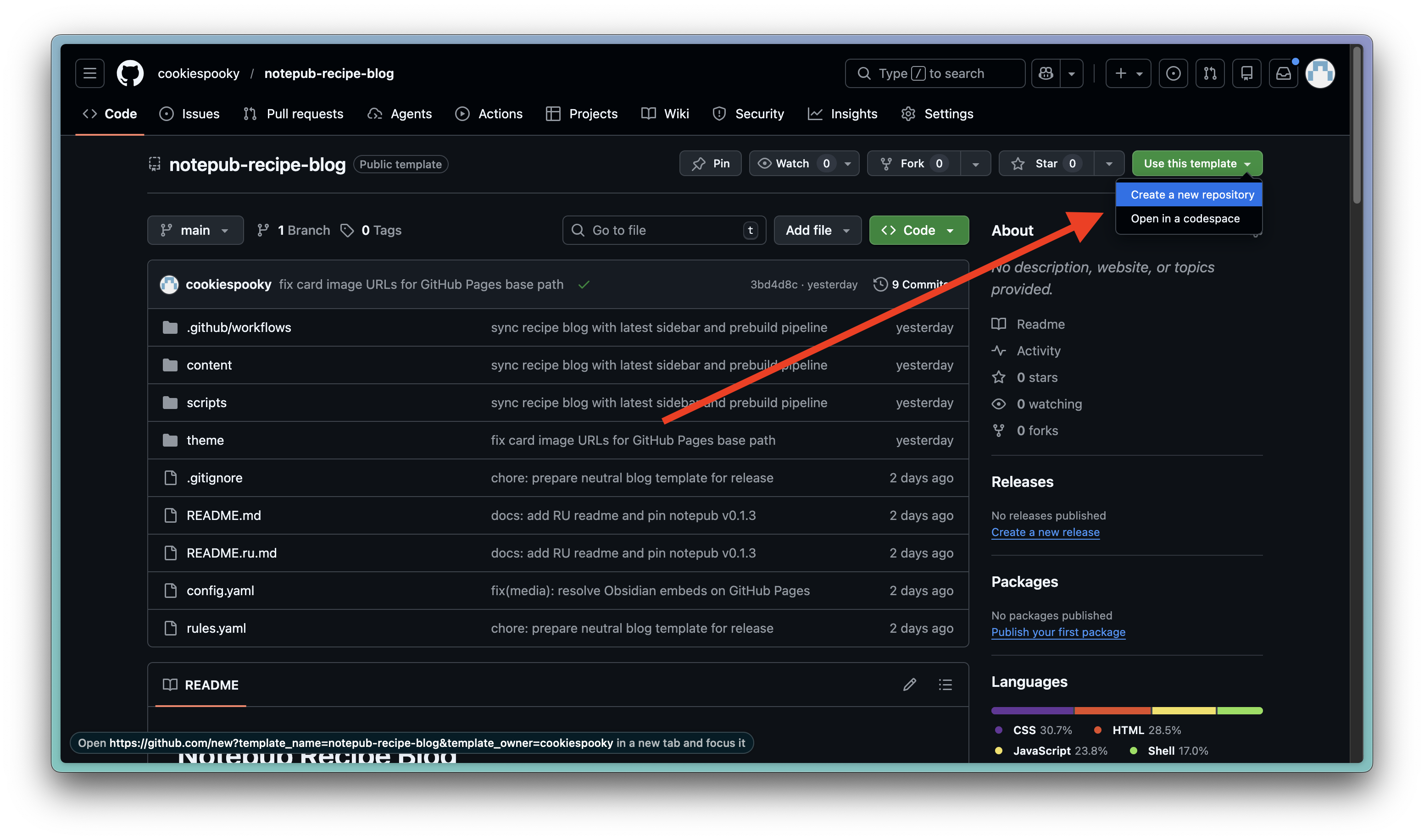 - Создайте репозиторий для вашего сайта через Use this template из шаблона Notepub. Доступные шаблоны